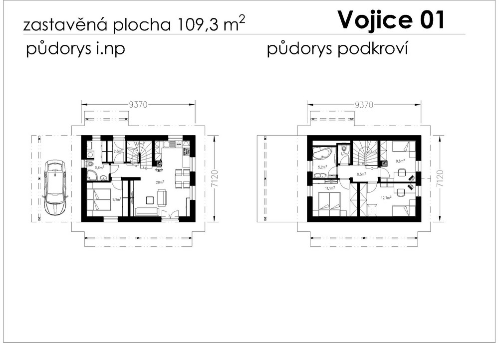 PATROVÉ RODINNÉ DOMYBUNGALOVYOSTATNÍ STAVBYPatrový rodinný dům - Vojice 01 zastavěná plocha: 109,3 m2 užitná plocha 1NP: 49,9 m2 užitná plocha podkroví: 48,7 m2 počet místností: 5+kk